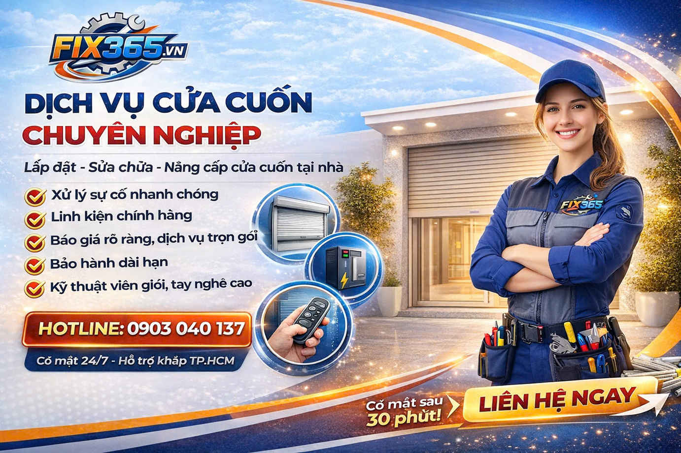 Dịch vụ cửa cuốn FIX365 mang đến giải pháp trọn gói từ lắp đặt, sửa chữa đến nâng cấp hệ thống cửa cuốn cho nhà ở, cửa hàng và doanh nghiệp. Đội ngũ kỹ thuật viên nhiều kinh nghiệm, hỗ trợ nhanh, xử lý đúng lỗi giúp cửa vận hành êm ái – an toàn – bền bỉ.