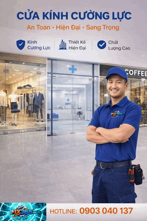 Dịch vụ lắp đặt cửa kính cường lực FIX365 mang đến giải pháp hoàn thiện không gian hiện đại, an toàn và sang trọng cho nhà ở, cửa hàng, văn phòng. Chúng tôi thi công đúng kỹ thuật, đo đạc chuẩn xác, sử dụng kính đạt tiêu chuẩn an toàn và phụ kiện chính hãng, đảm bảo độ bền – thẩm mỹ – vận hành êm ái lâu dài. Đội ngũ kỹ thuật viên FIX365 giàu kinh nghiệm, thi công gọn gàng, bàn giao đúng tiến độ.