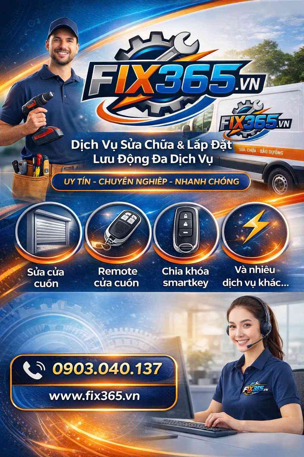 Fix365.vn là hệ thống dịch vụ sửa chữa – lắp đặt – bảo trì kỹ thuật tận nơi dành cho hộ gia đình, cửa hàng và doanh nghiệp tại TP.HCM và khu vực lân cận. Fix365 xử lý đa dạng sự cố kỹ thuật ngay tại địa điểm khách yêu cầu, bao gồm sửa cửa cuốn, lắp đặt cửa mới, làm và cài đặt remote cửa cuốn hoặc cửa cổng, làm chìa khóa smartkey xe máy, làm chìa khóa ô tô, cùng dịch vụ liên quan cửa kính cường lực và linh kiện kỹ thuật khác. Mỗi hạng mục dịch vụ đều có kiểm tra thực tế trước, báo giá rõ ràng và tư vấn giải pháp phù hợp để khách hàng chủ động lựa chọn phương án tối ưu nhất.